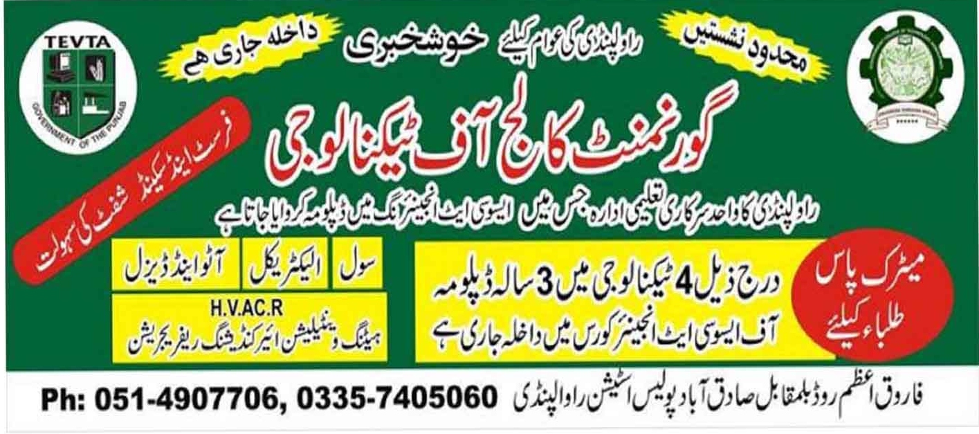 Government College of Technology (GCT) Rawalpindi is a prestigious technical institution in Rawalpindi, Punjab, committed to providing top-tier vocational and engineering education. As a TEVTA-affiliated institute, GCT aims to set the standard for technical training across the region